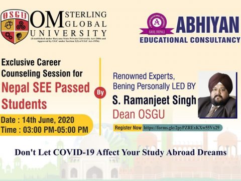 Om Sterling Global University in association with Abhiyan Educational Consultancy, Nepal is organizing a Career Counselling Session on 14 June, 2020 at 3:00 PM (Nepal Time)