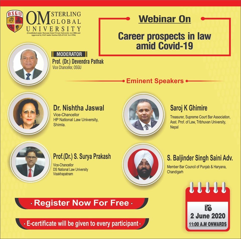 The Webinar on “Career Prospects in Law/Legal Studies amid COVID19” being organized by Om Sterling Global University, Haryana. The participants from worldwide community got the opportunity […]