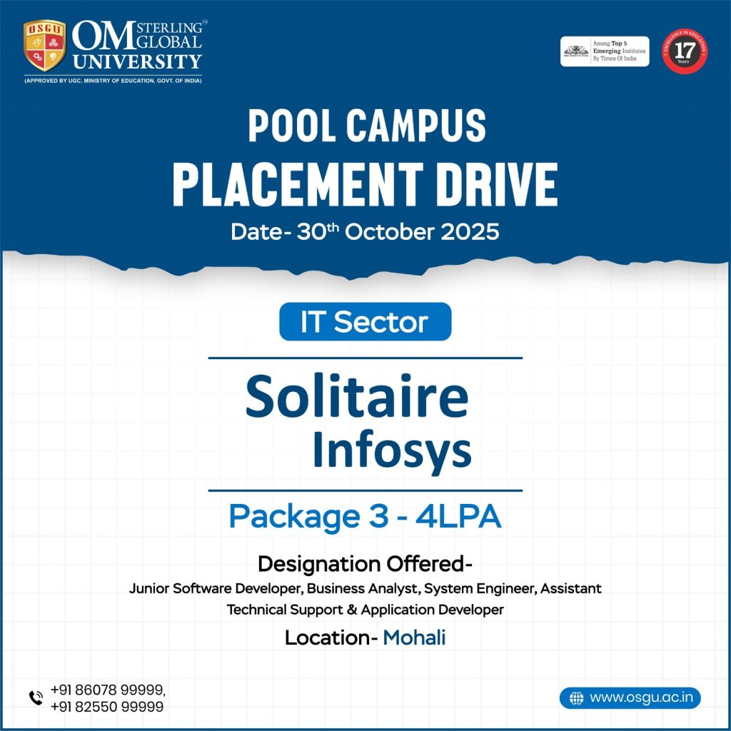 Om Sterling Global University was established in March, 2019 and is dedicated to achieve its vision, mission and objectives through academic excellence in all areas of knowledge and skills. The university is spread over 50 acres of fully-developed institutional land with a lush green campus, modern infrastructure and excellent academic atmosphere. Inspired by its vision and mission, the campus has been designed and developed with great sense of aesthetics to provide eco-friendly environment and ambience to provide comfort and zeal for learning. As a temple of education, the University aims at producing world class academicians, researchers and leaders in diverse fields by embedding high moral values in its students, commitment to excellence, and enthusiasm for continuous intellectual development.